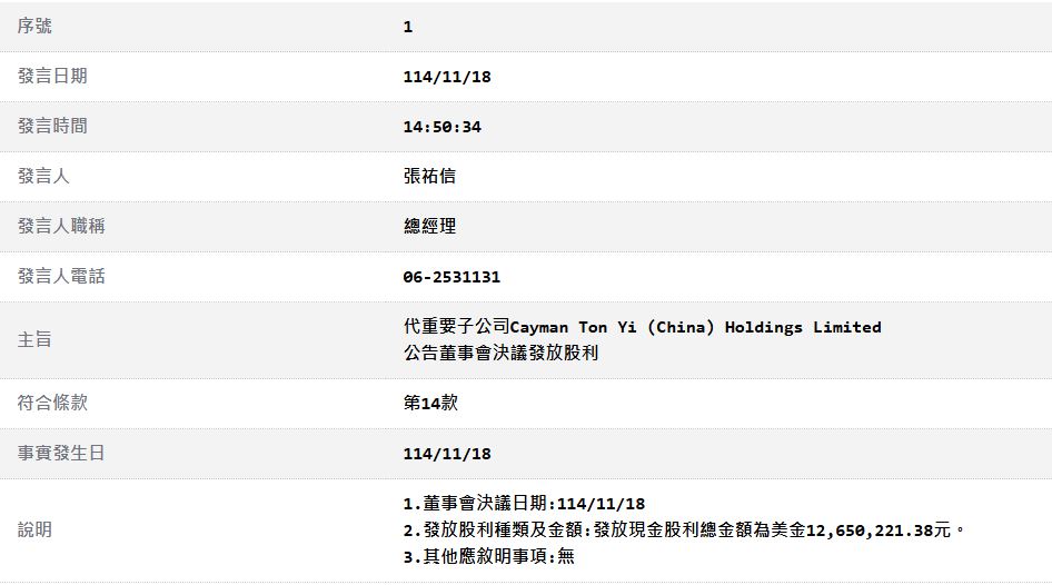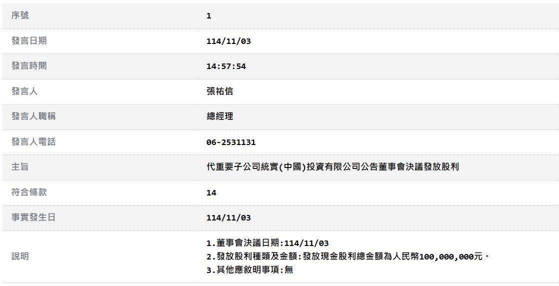 代重要子公司統實(中國)投資有限公司公告董事會決議發放股利