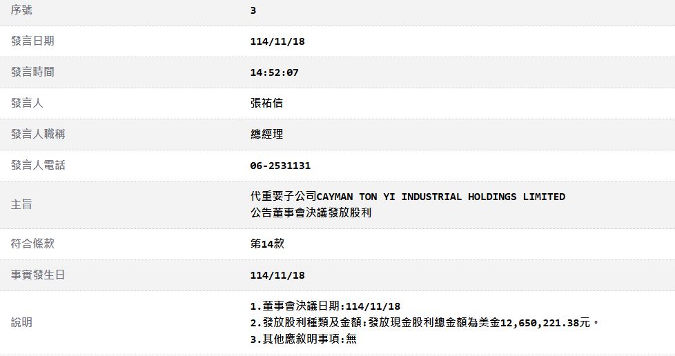 114/11/18代重要子公司CAYMAN TON YI INDUSTRIAL HOLDINGS..