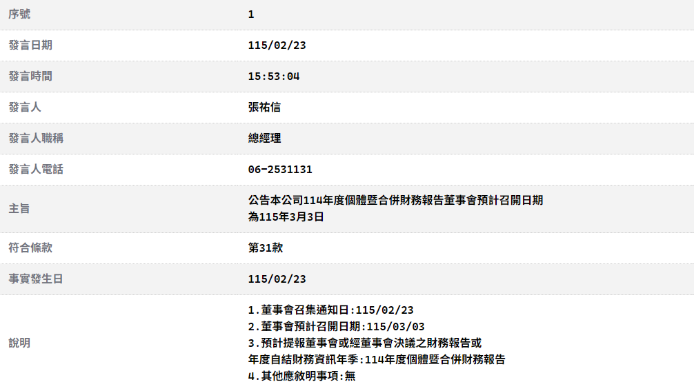 115/02/23公告本公司114年度個體暨合併財務報告董事會預計召開日期為115年3月3日
