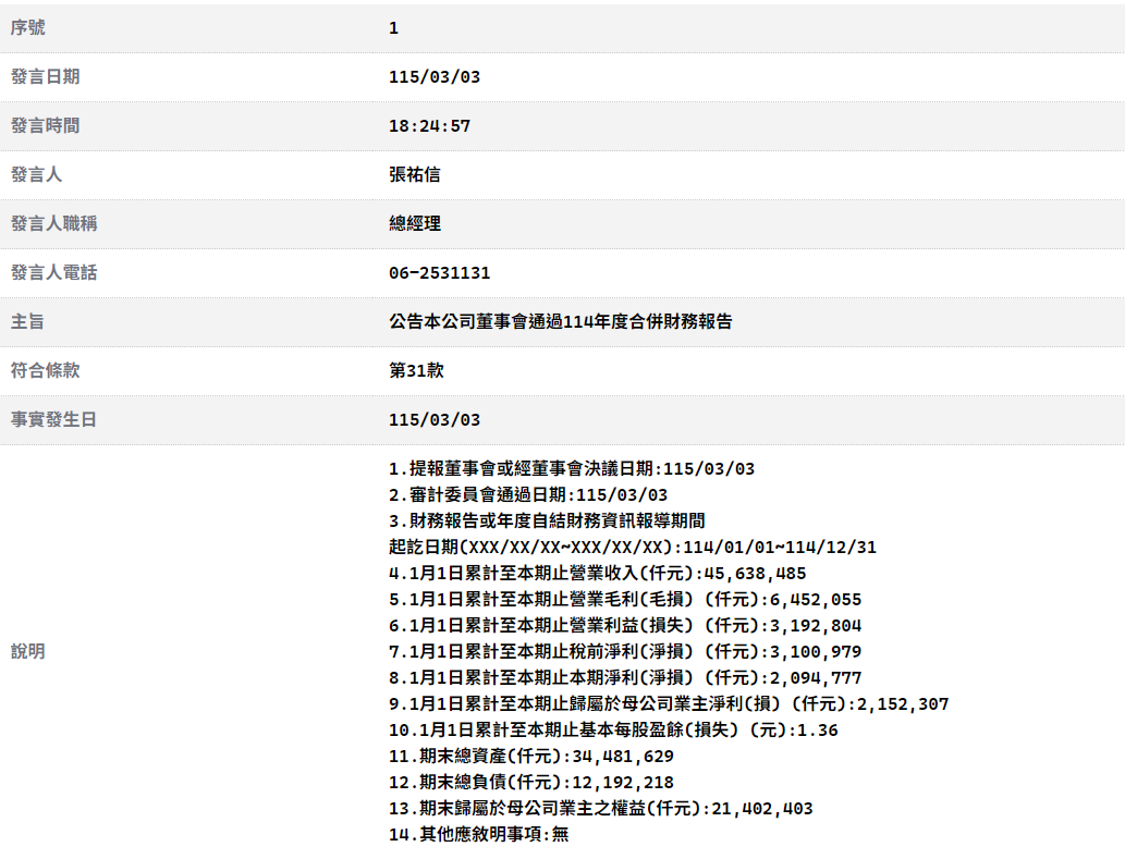 115/03/03公告本公司董事會通過114年度合併財務報告