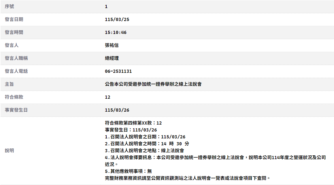 公告本公司受邀參加統一證券舉辦之線上法說會