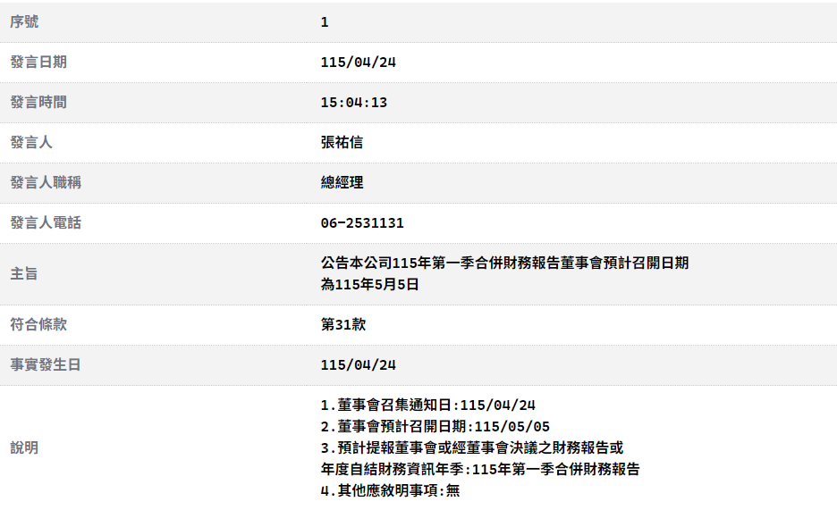115/04/24公告本公司115年第一季合併財務報告董事會預計召開日期為115年5月5日